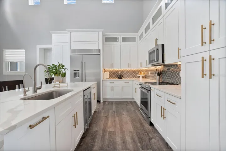 This residence goes above and beyond by catering to various interests. Imagine having your very own podcast studio, a generously sized 3-car garage, energy-efficient solar panels, and a separate workshop building. The journey begins with an impressive entrance featuring soaring ceilings that set the tone for the meticulous craftsmanship found throughout. The heart of the home boasts an expansive open-concept chef’s kitchen adorned with handcrafted cabinetry, quartz countertops, state-of-the-art appliances, and breathtaking views of the lake.