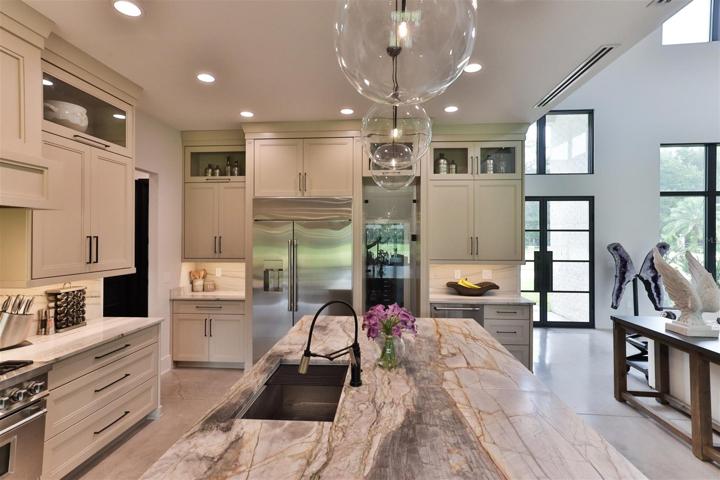 The open floor plan seamlessly integrates the indoors and outdoors, allowing for a seamless flow of natural light through the California sliding glass doors. The concrete floors add a touch of modern elegance to the space. With 5 bedrooms and 4 full bathrooms, plus 2 half baths, there is plenty of space for the whole family and of course plenty of custom closets. The bonus/playroom with French doors offers a versatile space that can be customized to fit your needs. The outdoor covered patios extend across the backyard, two full size hanging daybeds will be a tempting retreat. With a summer kitchen and outdoor shower this oasis is complete.