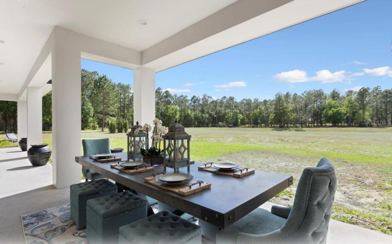 Welcome to this stunning luxury custom home in the exclusive and equestrian zoned Lakewood Ranches community in EUSTIS, FLORIDA! A truly enchanted 3.32-acre lot and premier property offers a tranquil setting surrounded by lush trees and trails, perfect for riding enthusiasts. This home showcases a contemporary design and a full spectrum of incredible features. You are welcomed in by the double iron and glass front doors, as you step into this breathtaking great room with a 22ft ceiling, your eyes are drawn upward to the beautiful and sleek floor-to-ceiling electric fireplace.