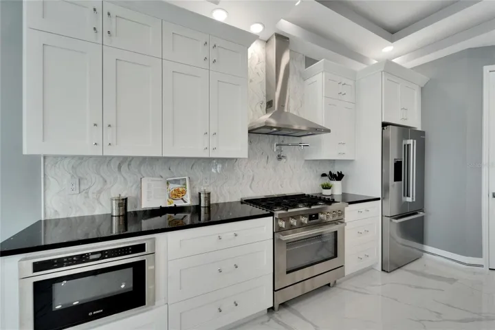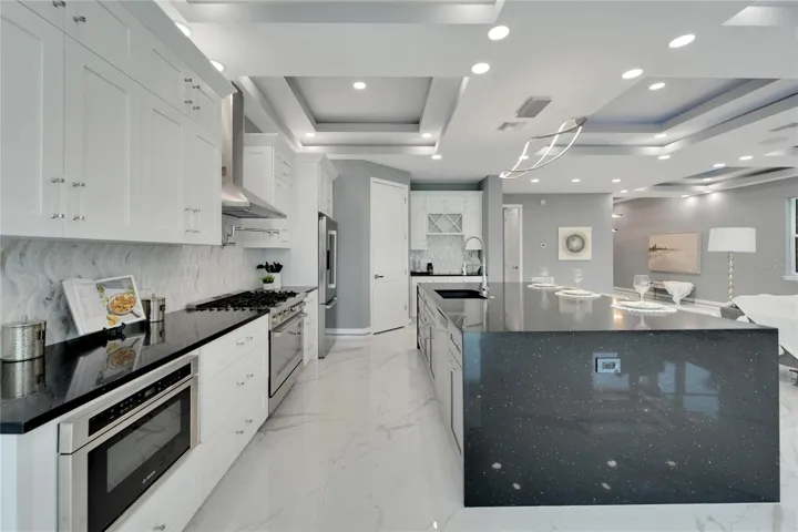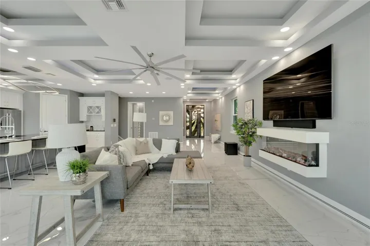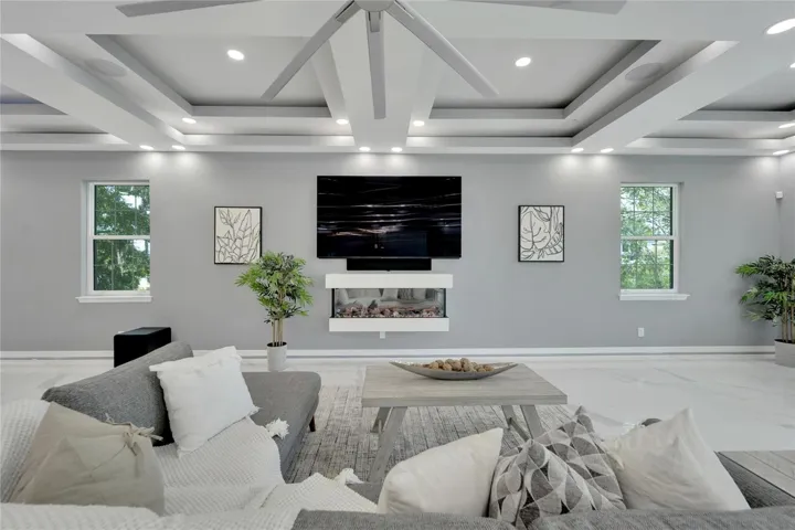 Designed for both daily living and entertaining, the kitchen includes imported quartz waterfall countertops, custom-built cabinetry, ample drawer storage, a pot filler, high-end appliances, and an ensuite bar/wine area. The living and dining areas feature a fireplace, triple tray ceilings, and custom LED lighting.