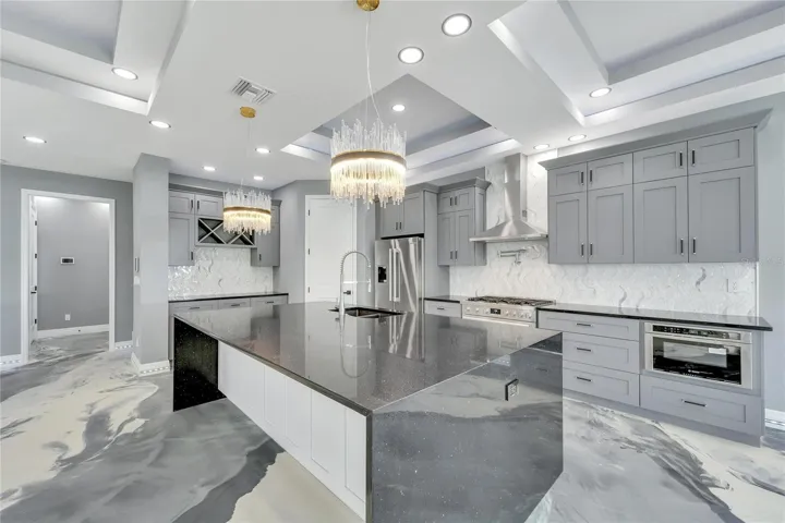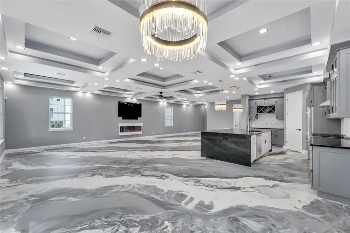 The kitchen is a culinary stronghold, equipped with top-tier appliances, quartz waterfall countertops, custom-built cabinets, a double sink, and a pot filler. An adjacent bar/wine area enhances the kitchen’s functionality. The living and dining areas, accentuated by a cozy fireplace, triple tray ceilings, and bespoke lighting, including LED and accent lights, create an atmosphere of refined masculinity.