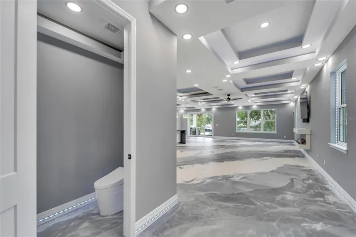 The home’s exterior is formidable, with strategic lighting, comprehensive landscaping, an oversized driveway, and concrete steps. Constructed well above the flood plain, it offers both security and peace of mind. Bathrooms feature high-end mirrors and electric toilets, underscoring the property’s luxury. The pervasive use of glass and light throughout amplifies its modern, inviting aesthetic.