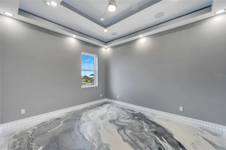 Strength and sophistication merge with block construction and custom-laid epoxy floors throughout. The garage is a testament to functionality, featuring overhead built-in storage and premium epoxy flooring. Direct access to the private pool from the lower balcony emphasizes seamless indoor-outdoor living.