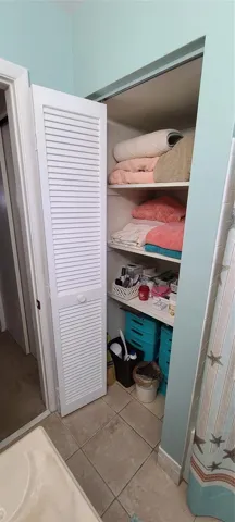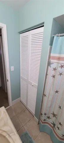 and a large hall closet on the left. The bathroom is at the end and has a storage closet, shower with tub and Plantation Shutter. When you head