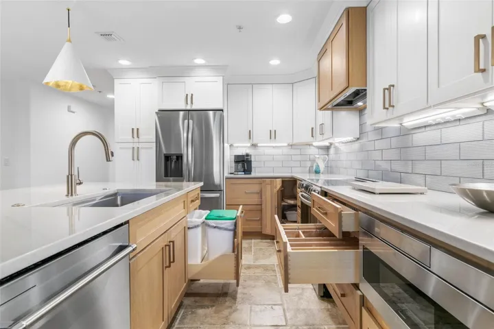 The redesigned kitchen is the centerpiece of the home, featuring solid wood cabinetry, quartzite countertops, tile backsplash, under-cabinet lighting, and a large center island ideal for entertaining or everyday living. High-end stainless steel appliances, including an induction range and microwave drawer, complete the space.