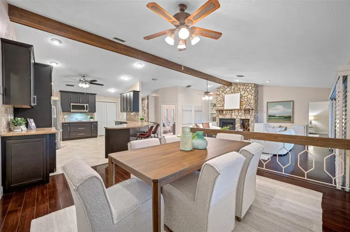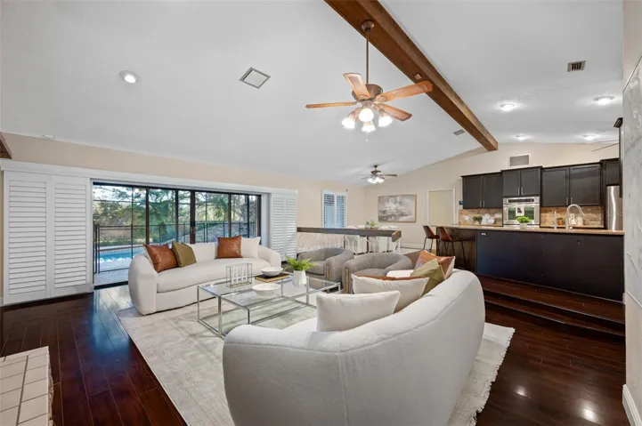 (Listed well under recent appraisal)This home is exceptionally desirable within the vibrant town of Safety Harbor and its close proximity to major shopping centers, restaurants, schools, parks, and more. Situated away from busy roads, the house offers privacy with no rear neighbors and an open view of green space and a pond. Unique landscaping, a side-load oversized garage, and a semi-circular driveway with additional parking set this home apart. Designed with families in mind, the home features a split floor plan and a spacious office near the front, boasting volume ceilings and ample natural light from a bank of windows. The heart of the home includes an updated kitchen and family room combo, with pocket sliders providing full view and access to the large pool area. Gleaming engineered wood flooring complements the updated kitchen, which is equipped with quartz countertops, newer stainless steel LG and KitchenAid appliances, a dual oven, a view-friendly refrigerator, plenty of cabinet space, and a wraparound breakfast bar, perfect for gatherings with family and friends. The family area also features a fireplace, adding warmth and coziness. The master ensuite is conveniently accessible and offers both a shower and tub, a walk-in closet, and dual sinks. The unique heated pool features two shallow ends and a soothing waterfall over a sculpted rock wall. Additional updates include a new roof and A/C in 2017, hurricane shutters throughout, an impact-rated window in the fourth bedroom, hard wiring for cameras, and more. SELLERS WILLING TO CONSIDER CONCESSIONS FOR MASTER BATH REMODEL WITH ACCEPED OFFER!