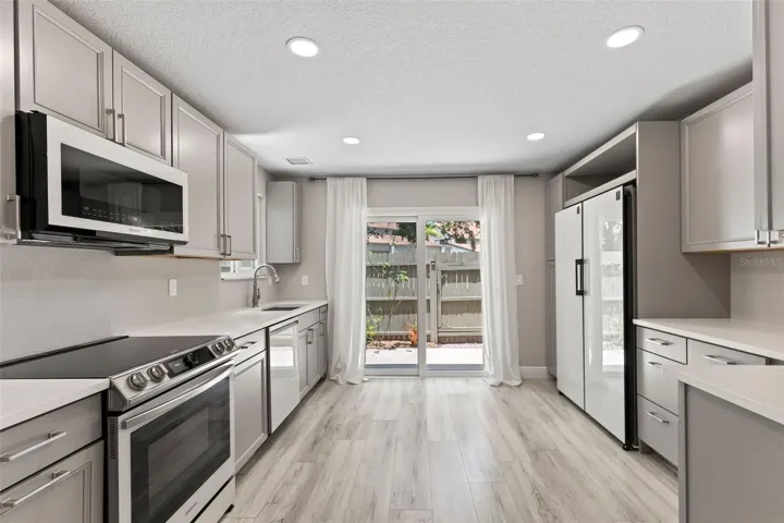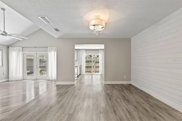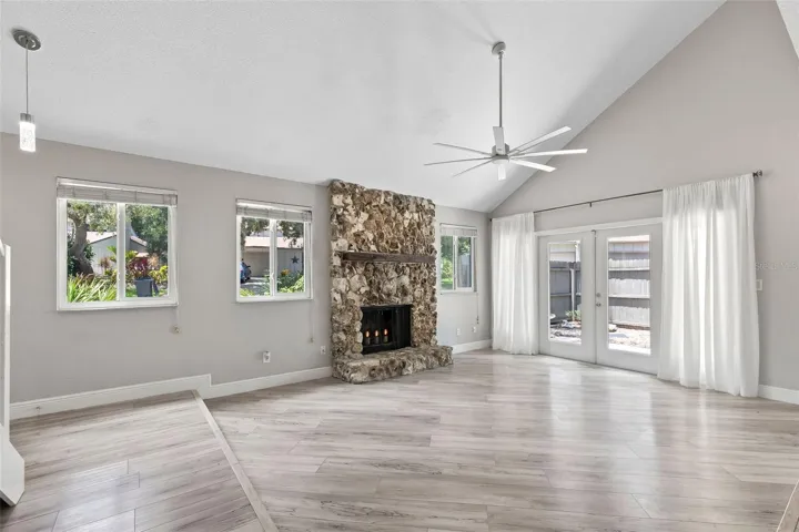 Welcome to your perfect sanctuary! Nestled in the highly sought after subdivision ”The Trails”, this end-unit townhome is a true gem offering the perfect blend of modern amenities and cozy charm. This townhome has been completely updated and the upgrades will dazzle you (see complete list – read on). As you walk through the front door you are greeted by a ”WOW FACTOR”. Beautiful new LVP flooring throughout. The living room has vaulted ceilings, coquina stone wood-burning fireplace and is bathed in natural light on 3 sides. Ahead, you’ll find a Dining room accented with shiplap, perfect for hosting family dinners or festive gatherings. Adjacent to the dining room is the NEWLY UPDATED Kitchen, boasting all new cabinetry, Quartz countertops, new Samsung Bespoke white glass appliances, undermount single bowl sink with workstation cutting & drain boards, Corner Lazy Susan’s, Pull out Garbage and Recycling Bins and lots of Drawers. It’s a Chef’s dream come true!! To the right of the Dining room, the layout offers a convenient first-floor Bedroom and Full bathroom. The current laundry room has been relocated upstairs for convenience to the Primary Bedroom, but the former space could still be a 2nd laundry room or use it as a flex room, storage or small office. Just beyond, you’ll find the attached two-car garage, making parking a breeze.