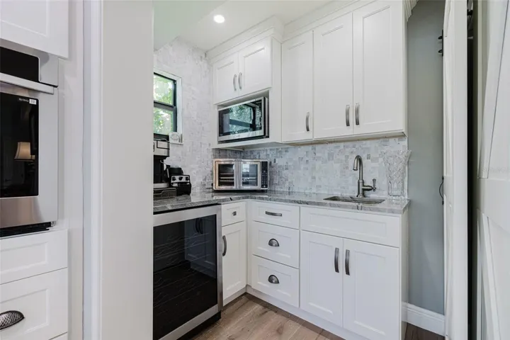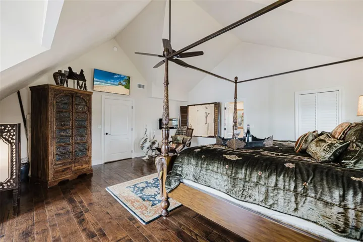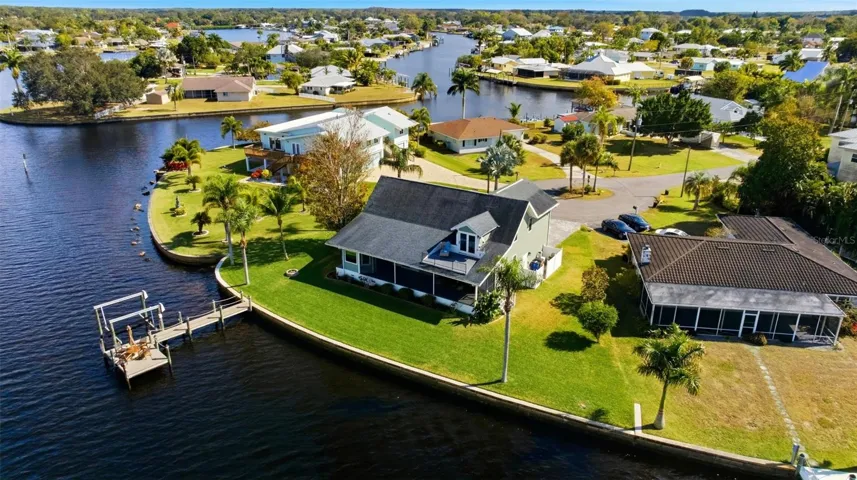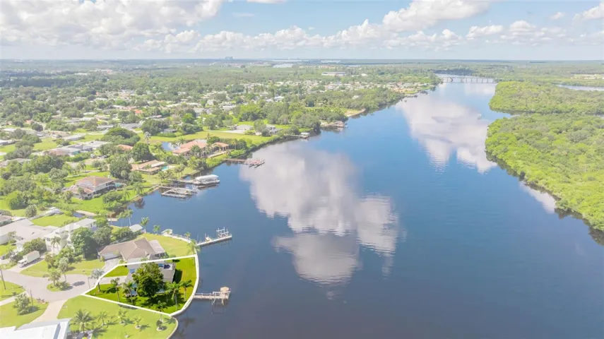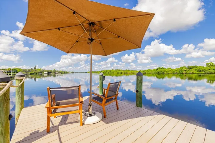 Wow! Exterior Makeover- Hardie Siding almost completed. Pick your color before it’s painted. A Stunning Elevated Riverfront Home. This gorgeous home sits at the end of a point, providing breathtaking 180 views Watch the manatees and dolphins swimming by from your patio, only steps away from the river. The balcony upstairs offers a glimpse of the picturesque scenery–have a look at the pictures for yourself! This house requires no updating, as all of the bathrooms, plumbing and impact windows have been recently installed. Each bedroom boasts its own bath, with one downstairs and two upstairs. The master bath is especially luxurious; with custom cabinets and granite countertops, designer tile, and a freestanding soaking tub. Bifold stained shutters open at the tub, offering a breathtaking view of the river. The kitchen and pantry are adorned with Quartzite stone countertops and a marble backsplash, along with brand new appliances. Downstairs, the floors are made of elegant 7 1/2” wide European White Oak. A composite dock and boat lift are ready for your boat. There is even room for a Pool and RV! This home offers furnishings negotiable with sale giving you the opportunity to tailor it to your preferences and lifestyle. As you approach the house, you’ll be greeted by a large, relaxing columned porch and elegant double doors that say, “Welcome home.”