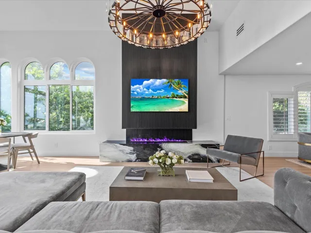 Inside, the open-concept layout is ideal for gathering — featuring a designer kitchen with marble countertops, high-end appliances, and a spacious dining and living area anchored by a dramatic water vapor fireplace. With 10+ TVs, a billiards room, and a dedicated office, every space has been curated for both comfort and entertainment.