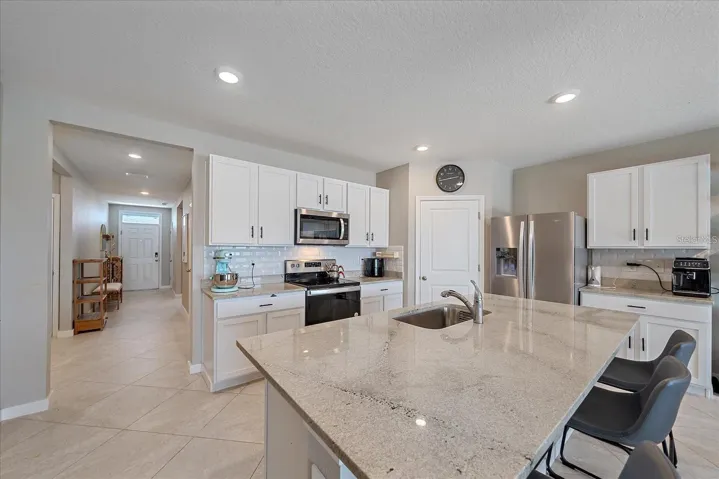 The bright and airy main living area welcomes you with new tile flooring and fresh paint, setting a warm and inviting tone. At the heart of the home lies a gourmet chef’s kitchen, a true culinary haven adorned with luxurious granite countertops, high-end fixtures, and a spacious walk-in pantry. The charming breakfast bar is perfect for casual gatherings or morning coffee, elevating every cooking experience.