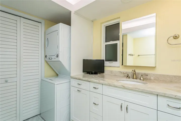 High and dry! This 17th floor jewel has magnificent panoramic water views of Boca Ciega Bay, gorgeous St. Pete beaches, and the iconic Skyway Bridge, that will take your breath way. Discover serenity in this two bedroom, two bath, 1700 sq ft haven. This spacious open floor plan has lots of natural light, water views from every window and lots of options for design creativity. This sought after condo comes with a priceless covered assigned parking space, hurricane shutters, and three storage units located on the same floor. The updated kitchen features granite countertops, LVP flooring, tile backsplash, and space for a small table. The generous bedrooms have large walk-in closets, and the primary bedroom has an updated en-suite bathroom that features tile floors, step-in shower, granite countertops and a stackable washer and dryer. The updated second bathroom has tile flooring, shower, and a beautiful onyx countertop.