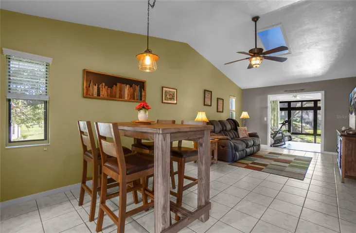 Inside, tile flooring runs throughout, and the vaulted ceiling with skylight fills the main living area with natural light. The galley-style kitchen features stainless steel appliances, dark cabinetry, and generous counter space. The open living and dining areas create an airy feel, while the primary suite offers a walk-in closet and private bath. A dedicated laundry room adds everyday convenience, and the roof was replaced in 2022 for added peace of mind.