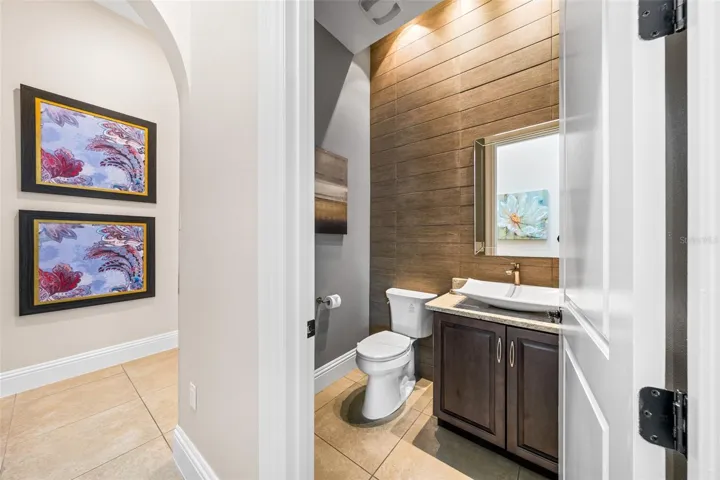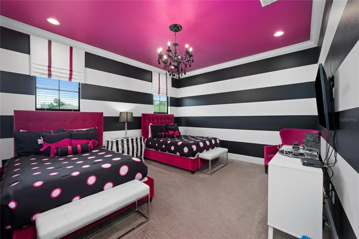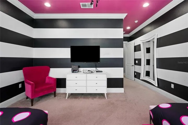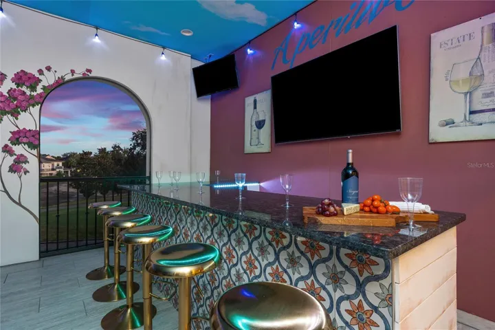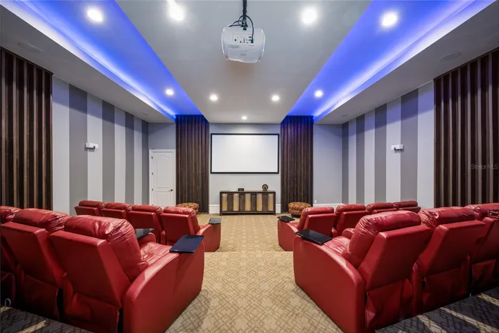 A stunning double staircase welcomes you to this incredible one-of-a-kind home. With a large open plan living room, summer kitchen, and covered lanai, there are plenty of spaces to relax and socialize. Experience luxury with a large private pool with spillover spa, sun shelf, and oversized patio. The home also features two additional gathering areas upstairs, a home theater and game room, and two themed bedrooms. The large balcony overlooking the golf course features 6 TVs to enjoy sports games, a pool table, ceiling fans, and plenty of seating.