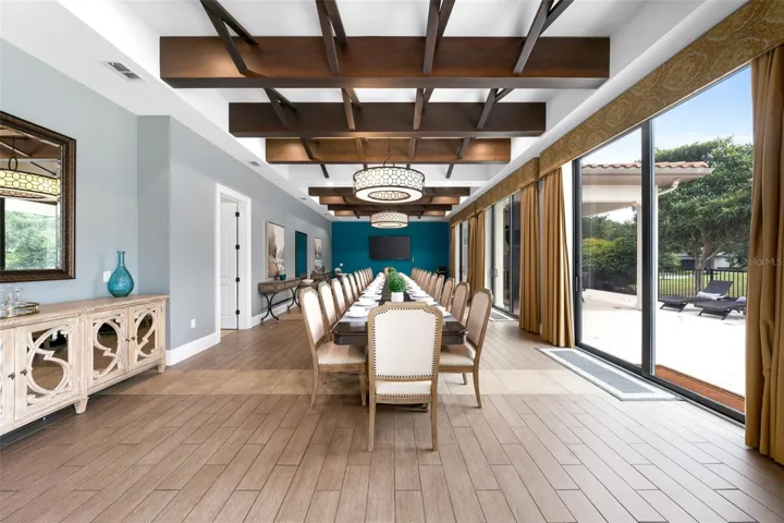 This one-of-a-kind home also attracts corporate retreat bookings, as it’s the perfect setting for company gatherings, executive meetings, training & team building. Guest can utilize the secondary catering kitchen and enjoy meals & snacks in the dining/conference room, covered lanai, or summer kitchen. The dining/conference room has a large table with seating for 32, the ideal setting for meetings. The theater room with a projector screen can be utilized to conduct a presentation or training session. Hold business meetings in the day, then entertain in the evenings.