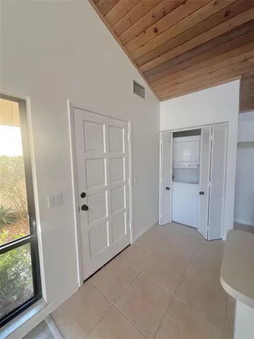 Step inside and be greeted by striking wood cathedral ceilings, skylights, and expansive windows that invite in abundant natural light, creating a bright and airy living space. The open floor plan flows seamlessly to a private screened lanai, perfect for morning coffee or evening relaxation. From here, enjoy quick access to the heated community pool, making every day feel like a vacation.