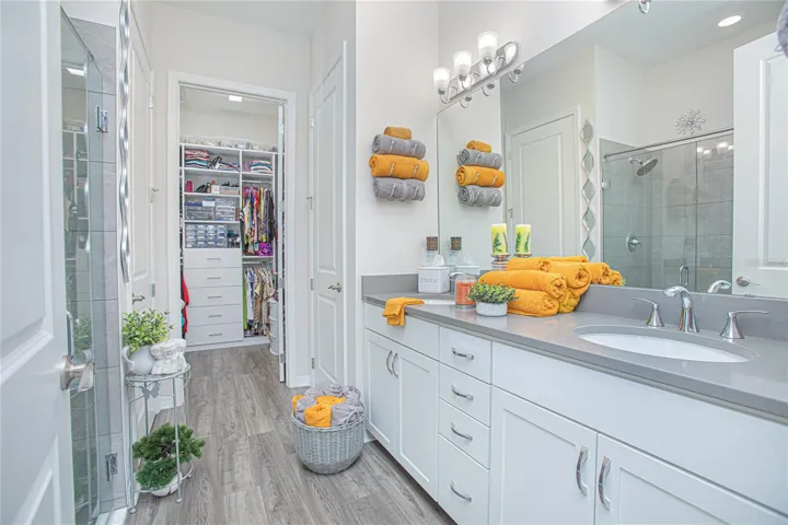 The spacious primary suite includes a walk-in closet and spa-style bath with dual vanities, quartz counters, and a walk-in shower with built-in bench. A split floor plan places the guest bedroom and full bath on the opposite side for privacy.