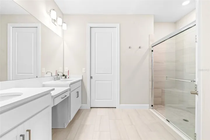 The generous primary suite offers a peaceful escape, featuring a large walk-in closet and spa-like bath with dual quartz vanities and a glass-enclosed shower with built-in bench. A bright flex room behind French doors can serve as a home office, craft space, or third bedroom.