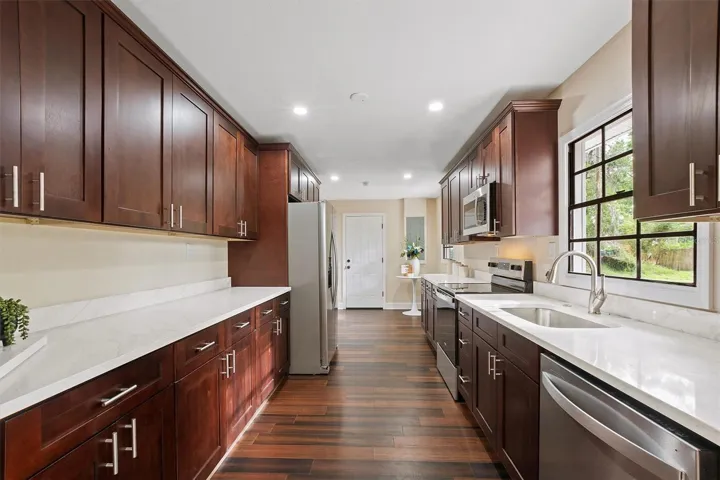 Inside, you will find a thoughtfully redesigned open-concept layout featuring brand-new kitchen cabinetry, modern fixtures, and completely renovated bathrooms with spa-inspired tile showers. Updates continue throughout the home with new doors including a stylish sliding glass door leading to the backyard, updated and framed windows for added charm and efficiency, new flooring throughout, a new water heater, and upgraded plumbing.