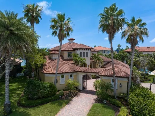 Elegant Italian Style Villa home with paved courtyard enclosed by decorative wrought iron gate. Welcome to 841 Ponce de Leon Drive – a Waterfront Estate in Tierra Verde where elegance meets ease! This architecturally stunning home is fully furnished and move-in ready with 5 bedrooms and 7 full baths. It blends high-end design with thoughtful functionality for the discerning professional or family seeking an elevated coastal lifestyle. Positioned along the Grand Canal, this home is only minutes away from waterfront restaurants, marine services and the Gulf.