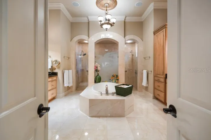 Two first floor oversized suites, one with a private exterior entrance, both have ensuite baths. The Master suite has an expansive walk-in closet with a built-in island, custom 2 tiered hanging space as well as an extra large shower with multiple shower heads and an oversized whirl-pool tub. The library/office, bonus room and 4 full baths – including a pool bath – maximize flexibility and comfort.