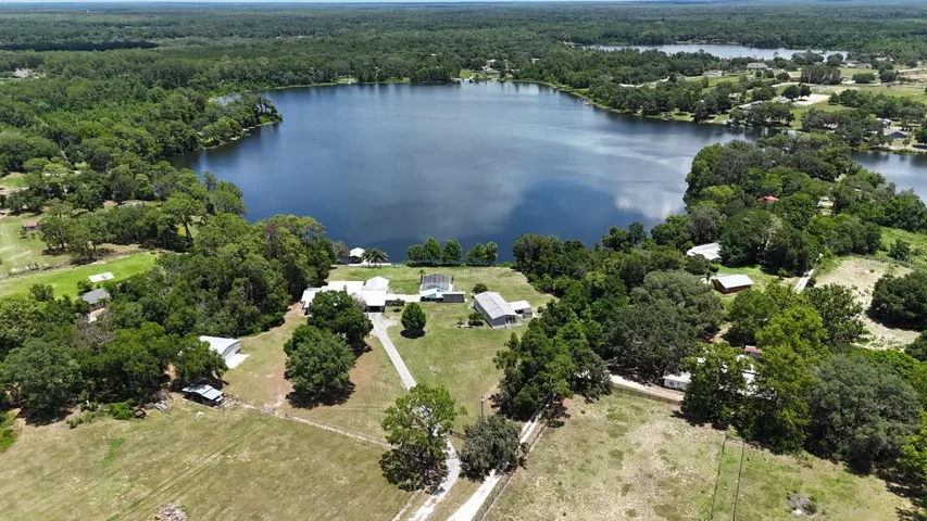 Experience the perfect blend of elegance and rural charm with this stunning lakefront estate featuring over 500 feet of private, spring-fed shoreline on Lake Fay. Situated on 14.75± acres and zoned A1, the property is ideal for equestrian or cattle use. The fully remodeled main residence includes a custom addition designed to capture natural light and panoramic views from sunrise to sunset. The spacious living area features a stone wood-burning fireplace, and the open-concept kitchen flows seamlessly into a large dining area, perfect for entertaining. The luxurious owner’s suite offers a gas fireplace, vaulted ceilings, French doors, expansive windows with private deck access, a coffee and wine bar, an elegant marble bathroom with dual vanities and a spa-style shower, and a 14′ x 14′ walk-in closet. The home also includes a second ensuite, plus two additional generously sized bedrooms, each with walk-in closets and thoughtful separation for privacy. Outdoor amenities include a screened 9-foot-deep pool, a cabana, an outdoor kitchen, and incredible pool-to-lake infinity views. A private dock with sun deck and boat lift enhances lakeside living. Additional features include a newer metal roof, three A/C zones, water softeners, Icynene insulation, a separate 2BR/2BA guest house with its own well and septic, a 60′ x 40′ equipment barn, an open-air two-stall barn, and fully fenced and gated grounds. This exceptional property is a rare opportunity for those seeking luxury, privacy, and space, just 20 minutes from The Villages.