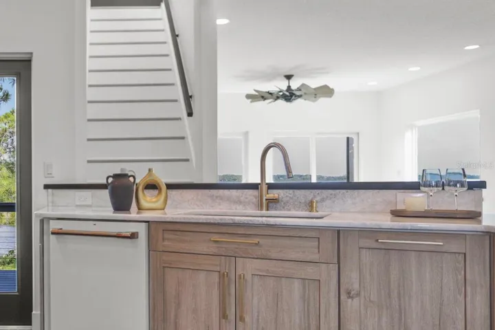 One or more photo(s) has been virtually staged. Welcome to your dream coastal retreat on Pine Island in Weeki Wachee, where every sunrise and sunset paints the sky in vibrant hues and you have water views from every room! This stunning 3-bedroom, 2-bath home has been transformed into a luxurious haven with top-notch coastal modern finishes that blend elegance and comfort. Imagine driving up to your oasis, parking under your elevated home, and relaxing in a charming seating area with serene water views. Your private paradise features a brand-new sea wall with steps leading to your secluded beach and direct gulf access—perfect for your boat or launching a kayak. The home itself is a masterpiece, with new hardie siding painted in deep blue that complements the shimmering waters. Expansive balconies with new composite decking and sleek cable railings offer perfect vantage points for savoring the breathtaking surroundings. Inside, the open-concept design showcases picture windows and wall-to-wall sliders framing spectacular water views. The kitchen is a chef’s delight, with custom cabinetry, exotic level 5 natural stone countertops, a custom designer backsplash, and state-of-the-art GE café series appliances. Every detail, from custom light fixtures to the chic bar area, has been thoughtfully crafted to create a functional and beautiful space. Luxurious LVP flooring flows throughout, while smooth level 5 walls enhance the coastal vibe. The guest bathroom, with custom tilework and designer fixtures, exudes sophistication. Each of the two main-floor bedrooms opens onto private balconies overlooking the water. Ascend to the top floor, where the primary suite awaits—an expansive sanctuary with vaulted ceilings and eastern and western views over the Gulf. New hurricane-impact windows and sliders flood the space with natural light. The master bath is a spa-like retreat with a spacious closet, separate tub and shower, and a private balcony overlooking the water, where you can enjoy your morning coffee or soak in the oversized tub with views of the moonlit sky. This one-of-a-kind property offers more than just a home; it’s a lifestyle. Nestled on Pine Island, you’ll be surrounded by nature, with dolphins, manatees, and otters as your neighbors. A boat launch for small to mid-size boats is just steps from your door, and Weeki Wachee River State Park is only 5-10 minutes away. With no rental restrictions, this home also offers incredible potential as a luxury vacation rental. Make it your private getaway or an income-generating paradise. Take a leisurely walk or hop on your golf cart to Alfred McKethan Pine Island Park, a 3-acre Gulf-front oasis with a beach, playground, volleyball courts, and a concession stand. Pine Island is a charming community, 6 blocks long and 2 blocks wide, with only about 40 homes. The optional HOA ($40/year) grants access to a private community dock, boat ramp, and beach. Experience the magic of island living—your ultimate Florida escape awaits. Schedule your showing today and make your island dreams come to life!