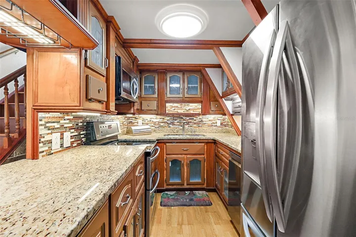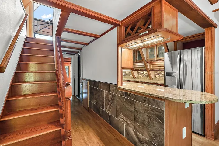 Boaters and Fisherman’s Retreat 3/2 1,800 sf. An adorable boater’s dream fully furnished: sleeps 7 and has everything you need and its all inclusive. Available for Rent for 1 month or longer. This unique home is the ideal retreat and it boasts a significant history; please refer to the attachments for this home’s fascinating story. Ideal for sailors, boaters or someone wanting a relaxing atmosphere. This home is a haven for those who desire to be on the water, be it full-time or just for a weekend getaway. Tucked away in a private oasis and within walking distance of downtown Eustis’ shops and eateries and less than a 10-minute drive to downtown Mount Dora and Tavares this hidden treasure is a portal to the endless adventures awaiting you on Lake County’s freshwater lakes and canals with direct access to Lake Eustis and the Chain of lakes, The home besides having it own dock is 3 houses down from the Marina. As you enter the property a circular driveway is established amidst the bamboo and palm trees leading you to the main attraction. The property provides plenty of room for your boat, whether a pontoon or sailboat, in two large, covered parking areas. The boat dock holds up to two 30ft in length boats. The property is conveniently situated near downtown Eustis, known for its delightful dining spots and quaint shops, a brief walk takes you to the Eustis Waterfront Grille on Lakeshore Drive, where you can indulge in fine dining, drinks, and stunning sunsets. The residence is well-maintained by the current owner and features a host of extras including two bedrooms and two full bathrooms on the ground floor, and a loft on the upper level perfect for a third bedroom, studio, or office. Storage is abundant and is available both indoors and outdoors, with three sheds on the property, with one that serves as an ideal man or women cave. Highlights include updated appliances within the past two years, granite countertops, a distinctive one-piece granite floor in the second bathroom, secret compartments, new windows, newly installed and refinished floors, shower towers in the main bathroom, minimal lawn maintenance, and a water softener to name a few. There are authentic artisanal features which include Venetian plaster, layered paintwork, and nautical teak rope trim. Experience the serenity of the waterfall just outside your living room on the lower level. The first floor houses the primary bedroom with an ensuite, a guest bedroom and bathroom, a galley kitchen, an ample pantry/office, and a laundry room. The rooftop deck offers an ideal retreat for relaxation or dining while enjoying the scenic views. Now is your chance to seize the day and become the Captain of your own waterfront boat home. Please note that this home is NO PETS and NON-SMOKERS ONLY!