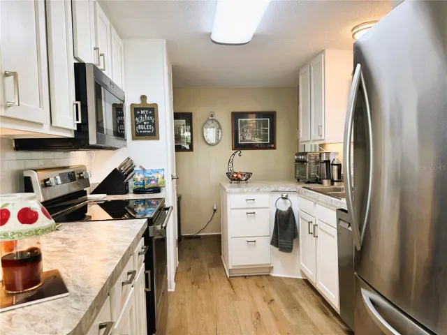 Inside, you’ll find luxury vinyl tile flooring that flows seamlessly through the home, updated windows, and all new light fixtures and ceiling fans that brighten every room. The kitchen is a true highlight, featuring tall updated cabinets, modern countertops, stainless steel appliances including a convection oven with an air fryer, and a 9” deep sink for added convenience.