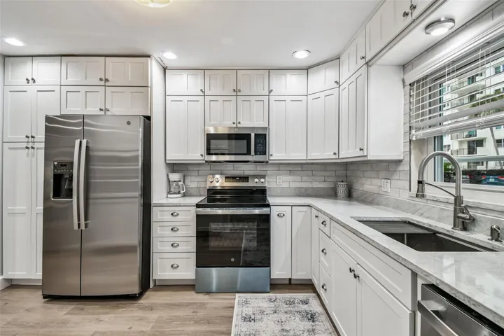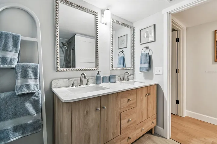 Inside, the home blends modern upgrades with relaxed coastal elegance. Luxury vinyl plank flooring flows throughout, complemented by a refreshed kitchen featuring marble countertops, new appliances, and pantry storage. The fully remodeled bathroom offers double vanities and a beautifully tiled walk-in shower—creating a spa-like retreat after a day at the beach.