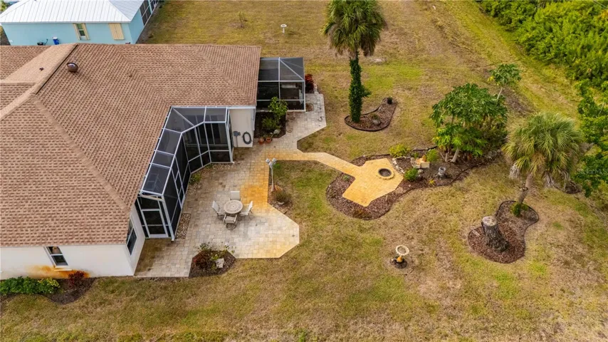 There is a certain ease to this 3 bedroom 2 bath home, a feeling that every room was planned to make everyday living more peaceful, more open, and more connected. Morning light drifts through every corner of this 2,292 square foot home, rising along 12 foot ceilings and tray accents as though the space was designed to greet the day. Rooms open naturally to one another, creating an easy rhythm throughout the home, and triple sliding glass doors gently blur the line between indoor comfort and outdoor living. Inside, the kitchen feels like the heart of the home, warm with natural tone cabinetry, generous counter space, stainless steel appliances, and a ten foot breakfast bar that is perfect for sharing meals or catching up with friends while cooking. A subtle plant shelf accent and pocketing doors add character and practicality without interrupting the home’s inviting flow. The primary bedroom provides a peaceful retreat, spacious enough for a cozy reading corner, and connects to an upgraded bath with dual granite vanities, a garden tub, and a walk around shower framed with glass block and dual showerheads. Two additional guest rooms share a bath that also opens to the outdoors, ideal for relaxed Florida living. Step outside the screened porch becomes a quiet pause before giving way to the open air paver lanai, where a curved pathway leads toward a fire pit area that becomes a favorite gathering place as the sky softens over the lake and distant vistas glow in the evening light. The oversized lot is framed by mature landscaping and supported by a private irrigation well with plenty of room to add a pool of your design. With Rotonda’s well kept neighborhoods, nearby golf courses, scenic pathways, parks, and easy access to some of the area’s finest beaches, the setting adds a natural sense of lifestyle to a home that already offers warmth, comfort, and space to enjoy it all.