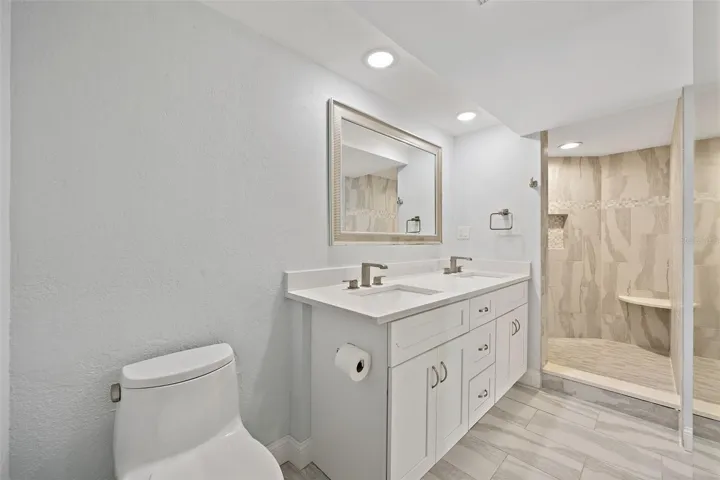 The interior has been thoughtfully updated with a modern kitchen featuring white cabinetry, quartz countertops, and stainless steel appliances, along with fresh finishes throughout including updated flooring and paint. The primary suite offers generous space, double vanities, and a walk-in shower, while the second bedroom provides flexibility for guests or a home office.