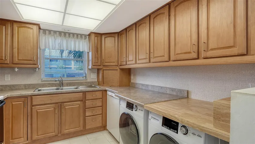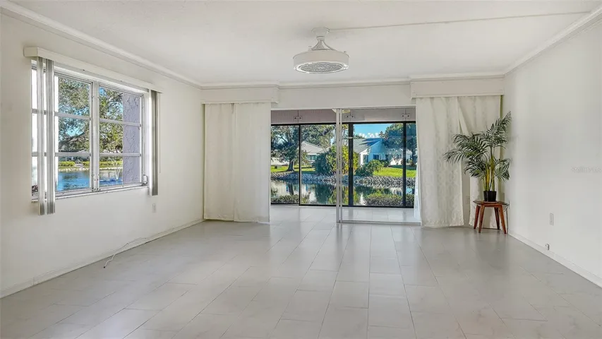 The spacious great room is filled with natural light, offering peaceful lake views and a flexible layout ideal for both comfortable daily living and entertaining. The great room easily accommodates a full seating area and dining space and opens seamlessly to the enclosed lanai, creating a relaxed indoor-outdoor flow.. The kitchen is designed for both functionality and style with updated wood cabinetry, a convenient breakfast bar, 2021 appliances, a large pantry, and laundry conveniently located under counter for everyday ease and efficiency.