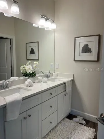Inside, you’ll find LVP and tile flooring throughout (no carpet) and bedrooms with full baths on both the first and second levels—ideal for guests, roommates, or multi-generational living. The open chef’s kitchen shines with quartz countertops, soft-close cabinetry, stainless steel GE appliances, modern finishes, and abundant natural light.