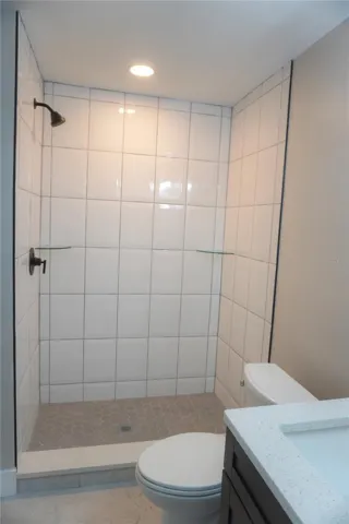 The interior features modern tile flooring throughout and a sleek kitchen with rich espresso cabinetry, quartz countertops, stainless steel appliances, and a breakfast bar, perfect for casual dining or entertaining. The bathroom includes a spacious walk-in shower with crisp white tile and hexagon tile flooring.