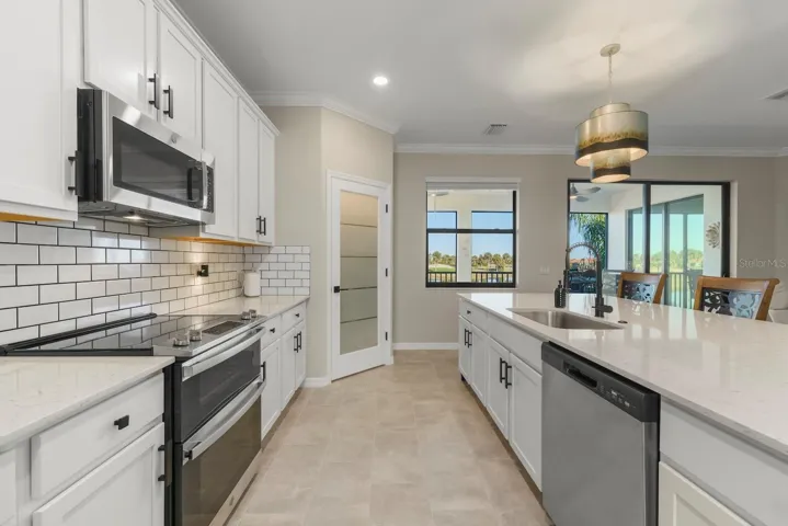 The spacious primary suite features custom wall and ceiling design details, private access to the screened lanai, and views of both water and golf course. Two additional guest bedrooms offer flexibility for guests or office space. Additional features include SMART HOME TECHNOLOGY, HURRICANE IMPACT WINDOWS AND DOORS, generous storage throughout, and an oversized garage with space for two vehicles PLUS golf cart storage / tandem garage space.