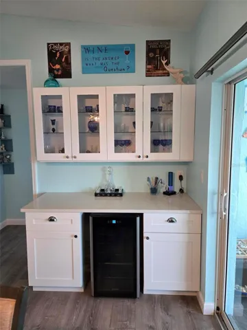 **Long breakfast bar seats four with custom tile work, foot-rail & quartz countertops in kitchen;