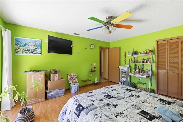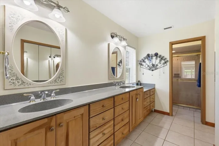 The property offers a 4-bedroom, 2.5-bath split floor plan, an oversized two-car garage, and an additional detached garage/workshop. The spacious kitchen features modern wood cabinetry and granite countertops. Amenities include a heated saltwater pool with spa, a Florida room adjacent to the family area complete with custom built-in bookcases (currently serving as a large office with panoramic backyard views), cathedral ceilings with recessed lighting throughout, and a brick wood-burning fireplace in the great room.