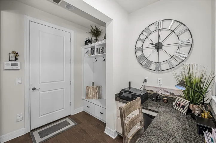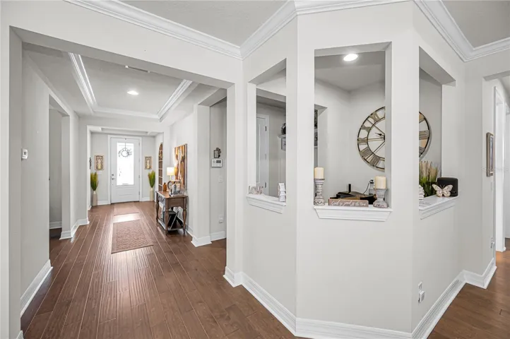 This impeccably maintained home shows like a model and offers nearly $75,000 in upgrades throughout. A pavered driveway leads to a striking leaded glass front door, opening into a welcoming foyer and spacious main living area featuring engineered hardwood floors. The kitchen showcases solid maple cabinetry with upgraded trim and molding, a glass tile backsplash, a large granite island, built-in oven and microwave, soft-close doors, tongue and groove drawers and pull-out shelving in all lower cabinets. A generously sized walk-in pantry provides additional storage. The family room features elegant crown molding and a distinctive coffered ceiling with views of the expansive, pavered patio and fully fenced backyard. The owner has also upgraded all the windows with elegant plantation shutters including the sliding glass doors and windows all ALL hurricane rated! The primary suite offers a spa-like bath with an extended walk-in shower, dual sinks and a walk-in closet. A built-in drop zone off the garage includes a desk and storage. A flexible formal dining room can also serve as a den or fitness room. The three-way split floor plan provides privacy for guests, including access to their own bath. Located in a gated, non-CDD community in centrally located Riverview, this home is close to local schools, including the nearby high school.