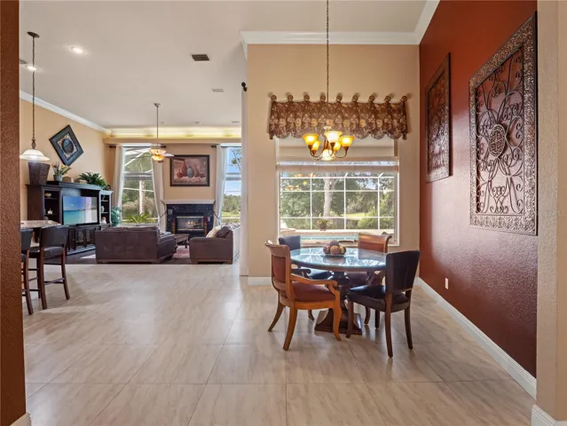 At the heart of the home, the kitchen offers both function and style with 42 inch cabinetry, granite countertops, a built-in desk, gas cooktop, and a spacious nook overlooking the pool and water.