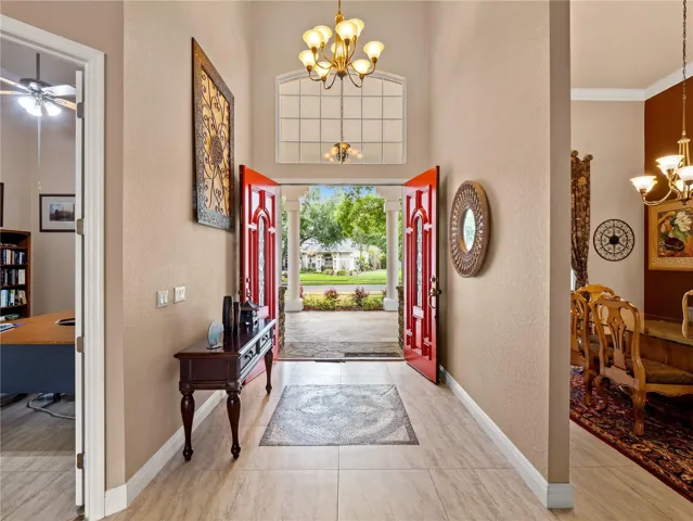 Step through the double wood and leaded glass doors into a light-filled interior where dramatic architectural details immediately take center stage. Soaring 14 foot ceilings, extensive crown molding, and expansive sightlines create a sense of openness and scale, while custom 10 foot sliding glass doors draw your eye straight to the outdoor living space beyond. The formal living and dining areas are anchored by an elegant foyer and designer lighting, offering a grand yet inviting introduction. A private den with double door entry provides the perfect space for a home office or study.