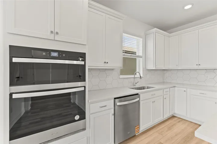 The kitchen stands out with a stylish backsplash, sleek cabinetry, and ample counter space, seamlessly connecting to the main living area. The home is also equipped with ceiling fans, adding comfort and energy efficiency throughout.