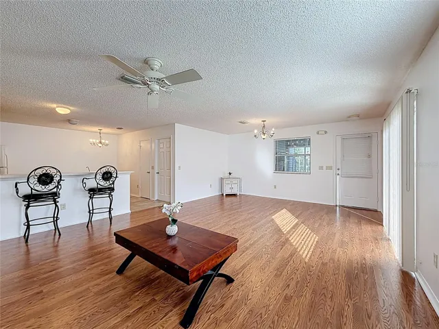 As you arrive, you’re greeted by an enclosed front lanai—an inviting space perfect for morning coffee, afternoon reading, or entertaining friends year-round. Come inside to an open and airy floor plan where the living and dining areas flow seamlessly together, creating a comfortable space for both everyday living and hosting guests. The kitchen is thoughtfully designed with a cozy dinette area and an eat-at counter bar, offering flexibility for casual meals or gatherings.