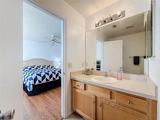 Both bedrooms are generously sized, providing comfortable retreats for residents and guests alike, while the guest bathroom is conveniently located in the hallway for easy access. The home also features a one-car garage with dedicated golf cart parking—ideal for embracing The Villages’ signature lifestyle.
