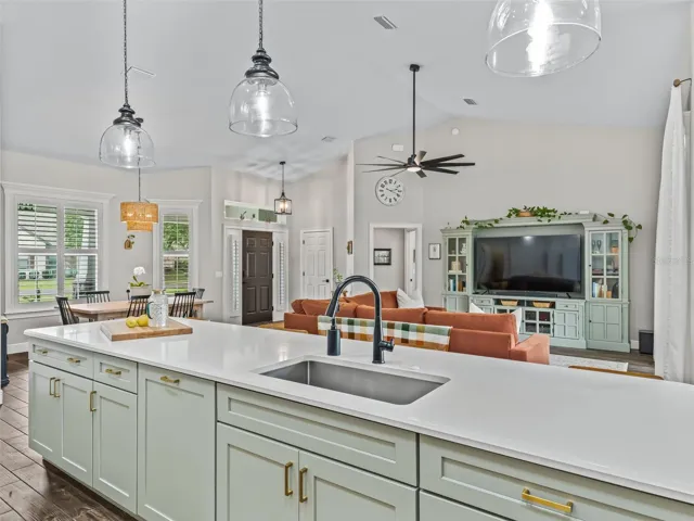 Impeccably maintained and upgraded home in the heart of Southeast Ocala in the community of Summerset Estates, set on a spacious lot overlooking a water retention area with no homes directly behind—offering both privacy and peaceful views. Beautiful curb appeal welcomes you with a covered front porch with pavers, manicured landscaping with lava rock, and an attractive blend of siding, stone, and wood accents on concrete block construction. Inside, soaring vaulted ceilings and a wide open floor plan showcase wood-look tile flooring throughout the main living areas. The open kitchen is designed to impress, featuring a 14′ quartz island with pendant lighting, touch-control faucet, soft-close cabinetry with designer hardware, custom vented hood, roll-out trash and recycle bins, double oven range, paneled dishwasher, upgraded refrigerator, and closet pantry. Triple sliding glass doors pocket into the wall and lead to the covered and screened lanai with matching tile flooring, opening to a spacious paver patio with raised garden beds, drip irrigation, and lime rock walkways for a clean, manicured look. The backyard is privacy fenced along the sides with open fencing along the rear to preserve the view—creating a quiet, relaxing setting. The primary suite offers vaulted ceilings, lanai access, a sitting area, two walk-in closets, and an ensuite bath with dual sinks, soft-close cabinetry, walk-in shower, garden tub with beadboard surround, and separate water closet. On the opposite side, two additional bedrooms share a full bath with tiled walk-in shower and convenient lanai access around the corner—ideal for a future pool bath. Additional features include an indoor laundry room with utility sink and plenty of storage, side-entry two-car garage, plantation shutters throughout, custom window and door woodwork with crown molding in the main areas, Nest thermostat, upgraded lighting and fans, full gutter system with underground drainage, Ring cameras, attic access with walkable storage, and reclaimed water irrigation system. Please enjoy the video and 3D tours, and schedule your private showing today.