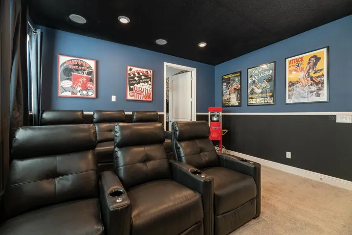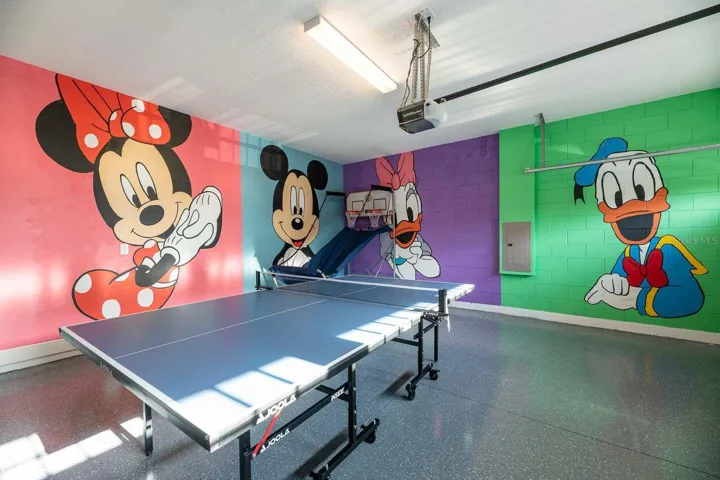 The open-concept floor plan features a bright and spacious living area, a fully equipped modern kitchen, and a dining space ideal for gatherings. The garage has been converted into a private game room, while the upstairs loft functions as a home theater, providing multiple entertainment areas for guests.