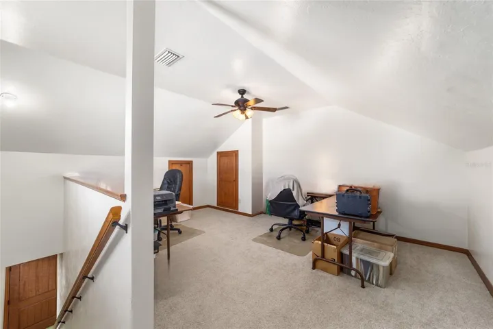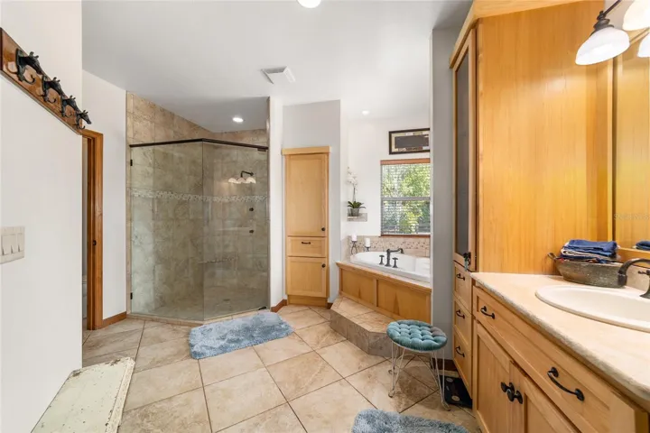 The primary suite offers peaceful views along with a walk-in closet and a spa-like bath featuring a soaking tub, tiled shower, travertine finishes, and abundant storage. Two additional bedrooms each offer walk-in closets and easy access to well-appointed full baths. An upstairs bonus room provides flexible space for an office, studio, or private retreat.