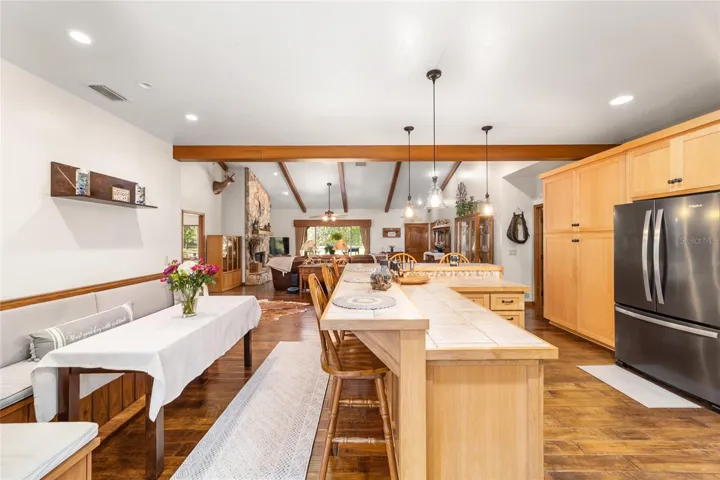 The kitchen blends beauty and functionality with custom cabinetry crafted from wood harvested on-site, generous storage, a gas cooktop, travertine accents, and a spacious L-shaped island with bar seating—ideal for entertaining or everyday living. A cozy dining nook with built-in bench seating adds charm and practicality.