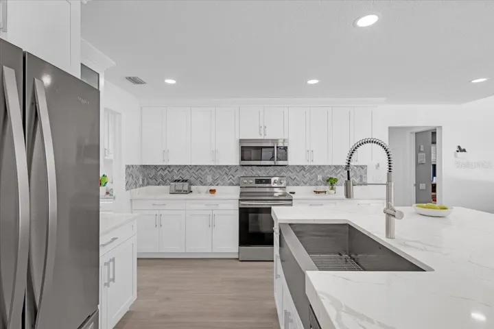 VA Assumable Mortgage at 2.75% interest rate for VA Buyers! Traditional Elegance in the mature, tree-lined neighborhood of Belle Meade. This is a rare opportunity to own a gorgeous Author Rutenberg .35-acre estate (90 x 169 lot) on a low-traffic cul-de-sac street. This spectacular, turn-key 4 bedroom + 3 bath pool home has over $175,000 in upgrades since 2020! The outdoor oasis feels like a park with a 1,450 foot screened-in lanai with a saltwater solar heated pool, an outdoor kitchen, a huge backyard with an outdoor fire pit area and playground. The landscaping was beautifully upgraded to include outdoor lighting, a custom expansive driveway with Flagstone pavers, and a fully fenced yard. The foyer entryway opens into a formal dining room and formal living room with luxury vinyl floors and cathedral ceilings. The Chef’s kitchen showcases 42” wood cabinetry with Quartz counters and a tile backsplash, a large island with a mitered edge, a stainless-steel appliance package, and custom pantry. The kitchen opens into a second dining area plus a spacious family room with vaulted ceilings and a wood-burning fireplace with custom shelving. All of the living rooms have expansive sliding doors that pocket behind the wall, perfect for indoor-outdoor living. There are two wings that are adjacent to the living room. Each wing has a fully remodeled bathroom and the remaining guest bedrooms. The spacious primary suite has a sliding door that pockets behind the wall and offers views of the pool and backyard. The primary bathroom was beautifully remodeled in 2020 and highlights a double vanity with Quartz counters, an oversized shower with seamless glass, and a garden tub and a large walk-in closet with custom cabinetry. Additional Upgrades include: NEW Dimensional Shingle Roof 2020, NEW AC 2021-25, NEW Whole-house PEX Plumbing 2025, Hot Water Heater 2020, Luxury Vinyl Flooring 2026, Custom Kitchen 2020, Custom Closets & Pantry 2025, Whole Home CAT6 Wiring 2023, Wi-Fi Water Softener & Reverse Osmosis System, Smart Sprinkler System, NEW Driveway Pavers 2025, NEW Gutter System 2025, Exterior Paint 2020, Interior Paint 2020, Window Film 2020, Exterior Fence 2020, Pool System to include Solar Heater, pump, filter 2020-24, Three Remodeled Bathrooms 2020, Painted Pool Deck 2020, Custom Laundry Room with a front load Washer and Dryer 2025, and more. Located in the top rated Steinbrenner school district. Odessa offers a variety of shops, restaurants, parks, playgrounds, golf, and more. Easy access to the Veteran’s, Airport, Downtown, & 45+ minutes to Clearwater/St. Pete beaches.