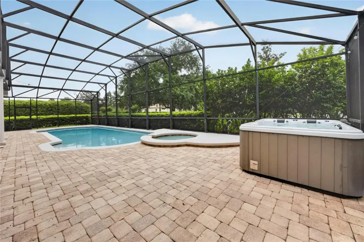 Step outside to your own private resort-style oasis, featuring a screened-in pool enclosure, expansive deck, heated spa, and an outdoor cooking area with grill, cooktop, and refrigerator —perfect for entertaining or relaxing.