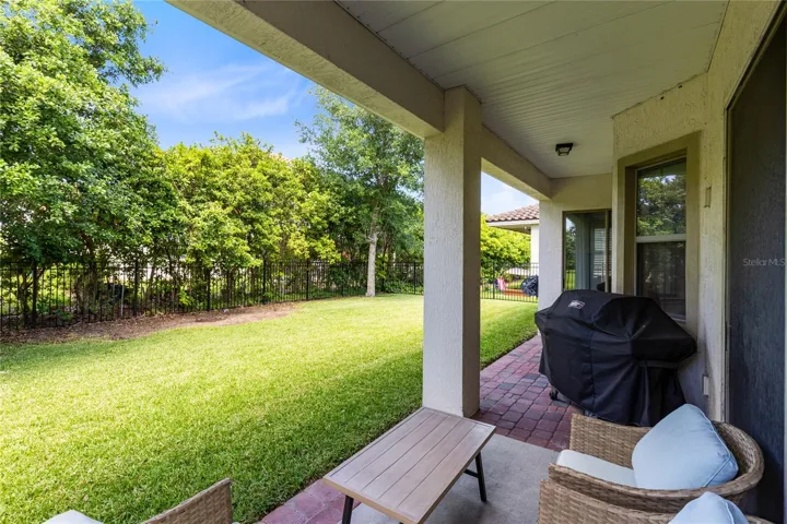 Outside, a covered patio runs the full back wall under a deep overhang built for Florida afternoons. Two sliders reach it, one from the family room and one from the primary, so the social and private sides of the house each get their own way out. The fenced yard backs to a tree-buffered green corridor instead of another rooftop, which is rarer in this part of Eagle Creek than the lot description suggests.